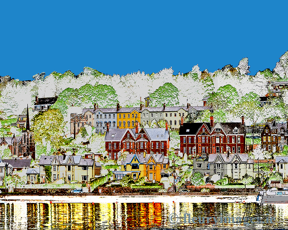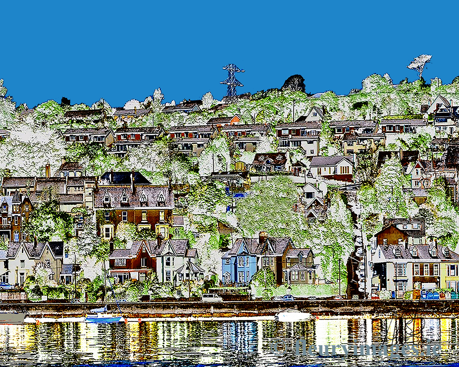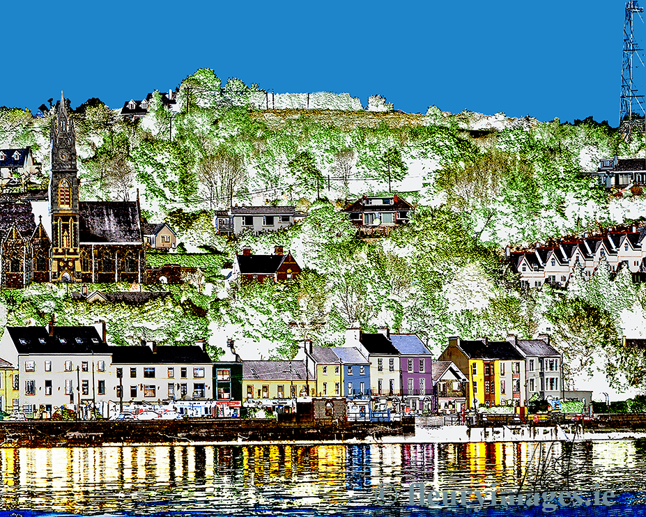 The village, which has a penny post to Cork, comprises a great number of detached villas and cottages, many being new and very handsome, particularly twelve beautiful marine villas recently built close to the shore; they are constructed in the pure Elizabethan style, and are chiefly occupied by respectable families as bathing-lodges, for which purpose the village is most favourably situated. It is built on the sides of a deep glen, which is thickly clothed with beautiful and thriving plantations, much increasing the natural beauty of the scene: the prospect is very extensive, taking in the woods of Ballybricken, Rostellan, and Prospect.